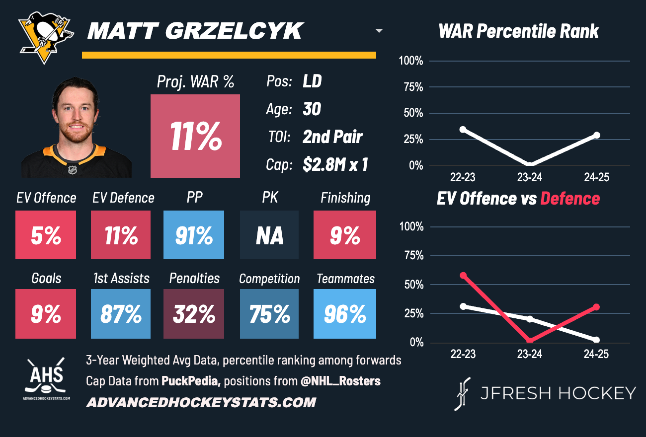 After coming off a career-high 40-point season with the Penguins, it's surprising that Grzelcyk remains unsigned. Yes, 15 points on the power play helps to inflate the scoring, and Grzelcyk will most likely not play on the Sharks' power play with Klingberg and Orlov now in the mix. Grzelcyk's analytics with the Penguins were not great, but during his time in Boston, he was an excellent puck mover.