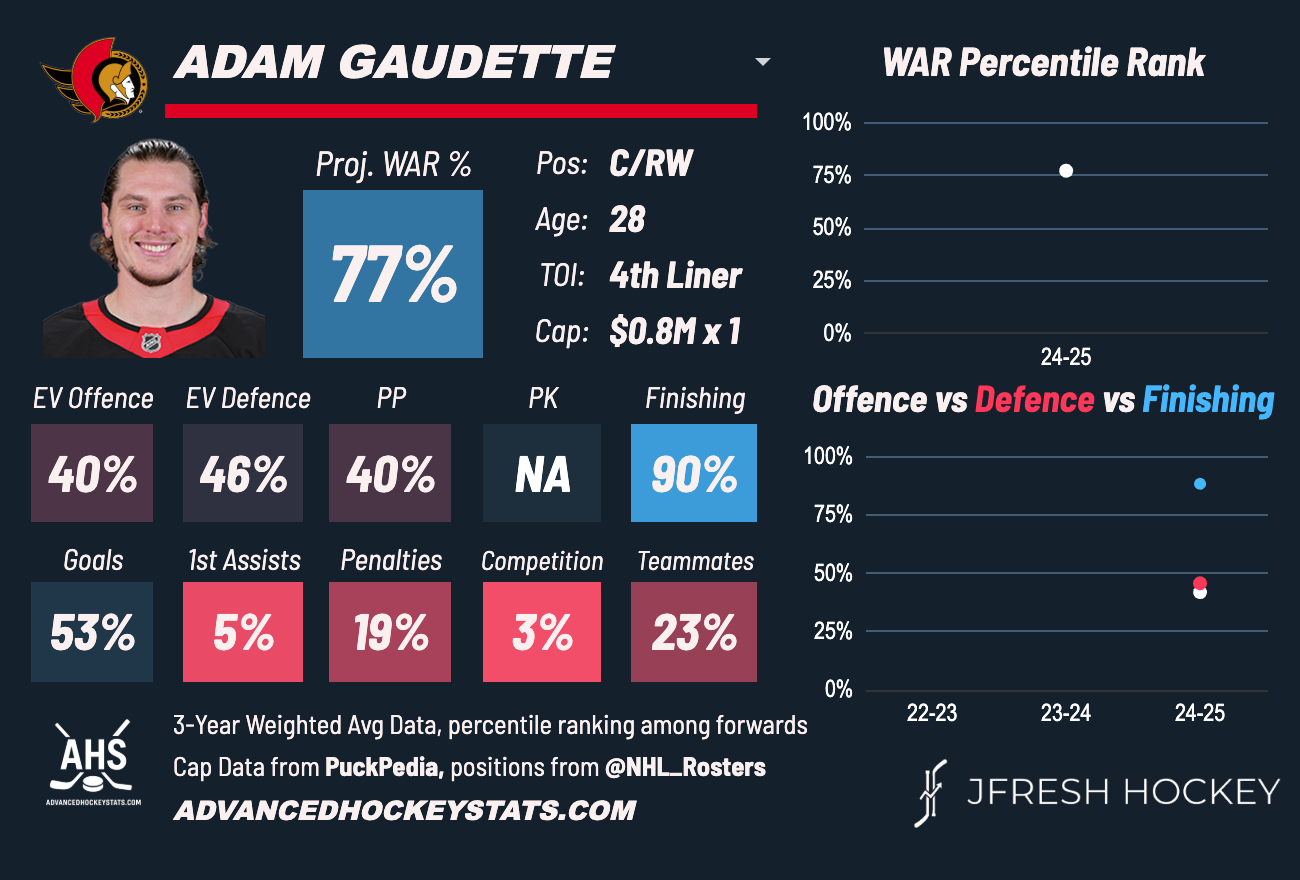 He posted solid analytics despite playing 4th line minutes for Ottawa. He did take advantage of lesser competition and shot an astronomical 21.1% last season. While that shooting percentage isn't sustainable from year to year, it shows that when given an opportunity, Gaudette can add scoring pop to a team.