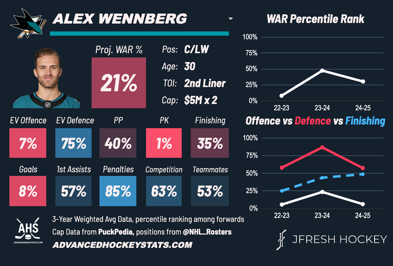 Alex Wennberg signed a two-year deal last summer for $10 million ($5 million AAV). Wennberg started the season as the third line center with Macklin Celebrini and Mikael Granlund in front of him. Wennberg was asked to take a lot of the defensive responsibilities for the Sharks, especially after the Granlund trade.