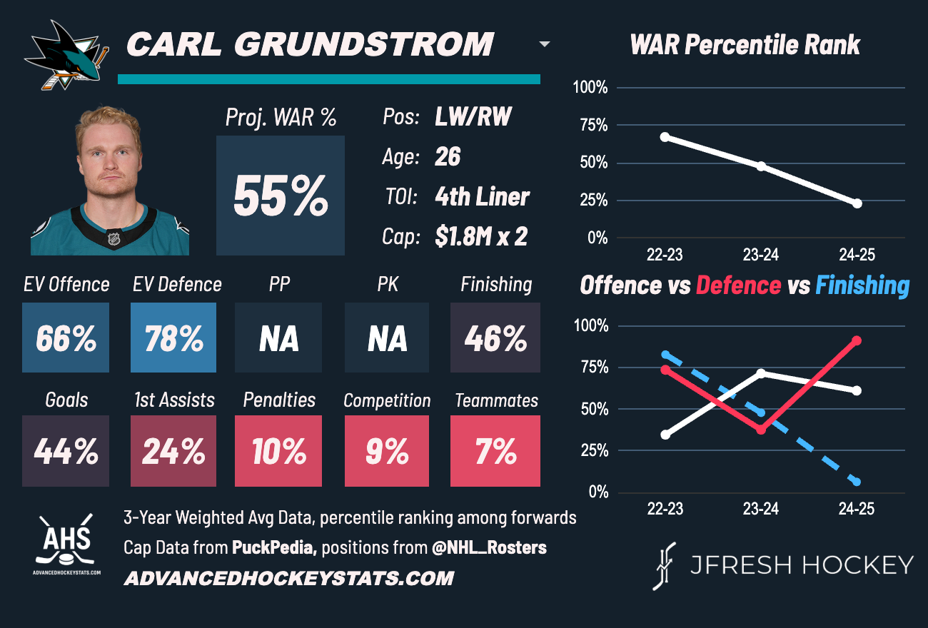 Don't be surprised if Grundström is the casualty of the Sharks' roster crunch. They currently have 49 of 50 contracts, but once Michael Misa and Sam Dickinson hit their 10th NHL games, their contract go into effect. The Sharks need to move a contract if they want Dickinson and Misa in the NHL all season.