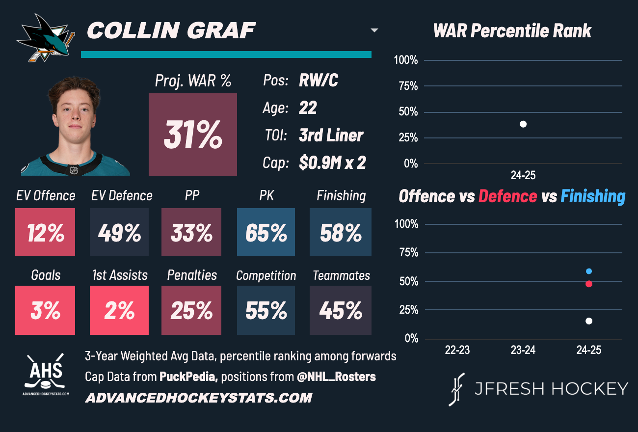 Collin Graf is entering the last year of his entry-level contract. If the Sharks are smart, they will look to get Graf locked up for a while. Evolving Hockey has Graf projected to sign an extension for two years at just under $1 million a season. Would expect to see something more in line with what Fabian Zetterlund signed after his trade (two years at $1.45 million). The Sharks would be wise to keep Graf around as he helps to fill several weak spots on the roster.