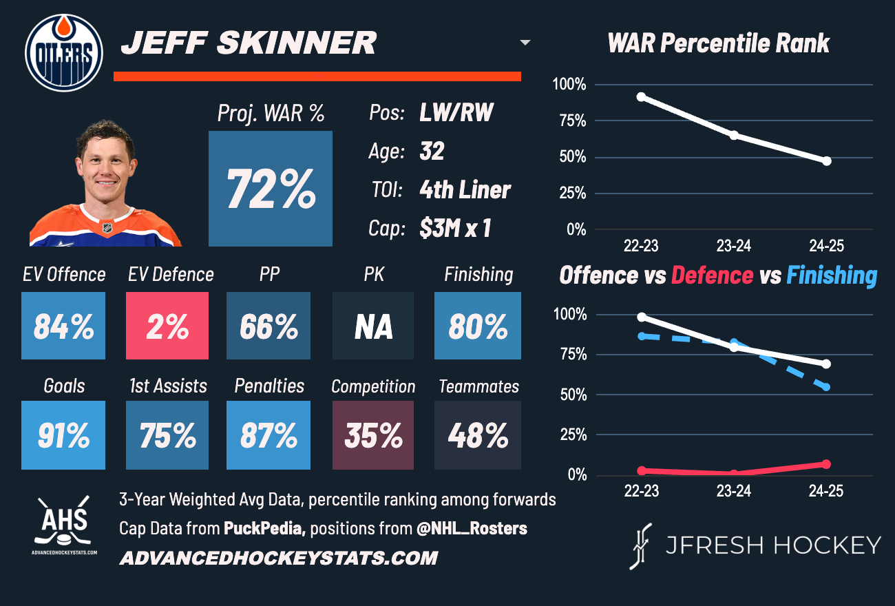 After approximately 1,000,000 years of missing the playoffs, Jeff Skinner signed with perennial Stanley Cup contender, the Edmonton Oilers. With the Oilers, Skinner saw his ice time drop from 16 minutes a night in his last season with the Buffalo Sabres to 13 minutes in a bottom six role. Skinner was still able to find the back of the net with a respectable 16 goals, but wasn't nearly as effective a player as we'd seen in the past few seasons. Skinner also had two points in his five playoff games for the Oilers in their march to a consecutive Stanley Cup Finals loss to the Florida Panthers.