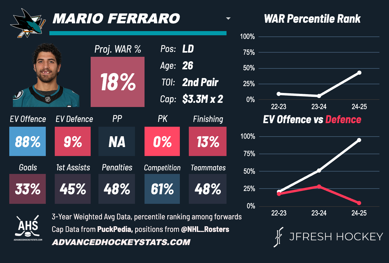 Mario Ferraro is entering the last year of his four-year contract at $13 million. He's been one of the heart and soul players for the Sharks since his arrival in the 2019-20 season. He's currently the longest tenured player and wears a letter.