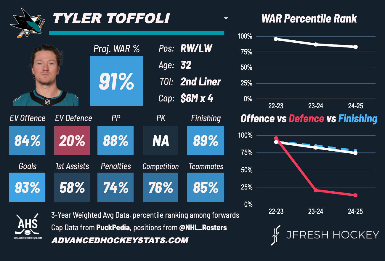 Tyler Toffoli signed a 4-year contract worth $24 million ($6 million AAV) last offseason to settle down after playing for about 45 teams over the past few seasons (7 different teams from 2020-2024). Toffoli had an instant impact for a San Jose Sharks team in need of more offense. He finished first in goals with 30 and third in points with 54.