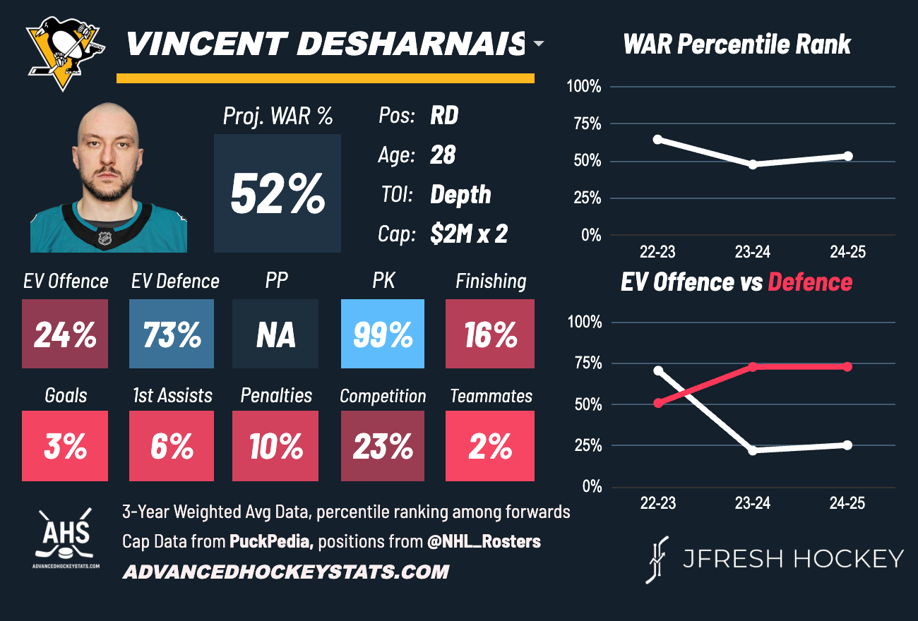 It was an adventurous season for Desharnais, who started the year with the Vancouver Canucks, was traded to the Pittsburgh Penguins on January 31 as part of the Marcus Pettersson trade. The Sharks sent a 2028 fifth-round pick for Desharnais right before the trade deadline. Desharnais played seven games for the Sharks before being shut down with an undisclosed upper-body injury.
