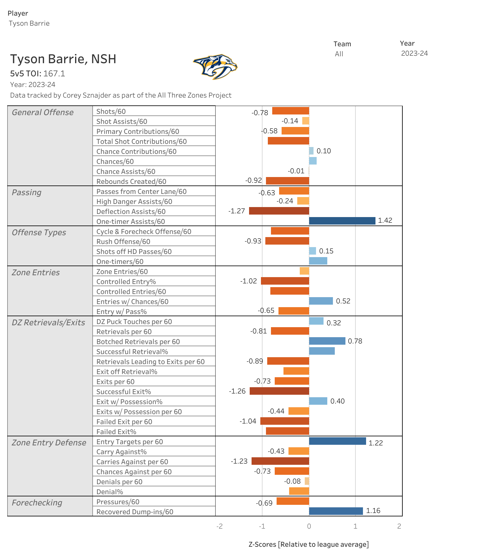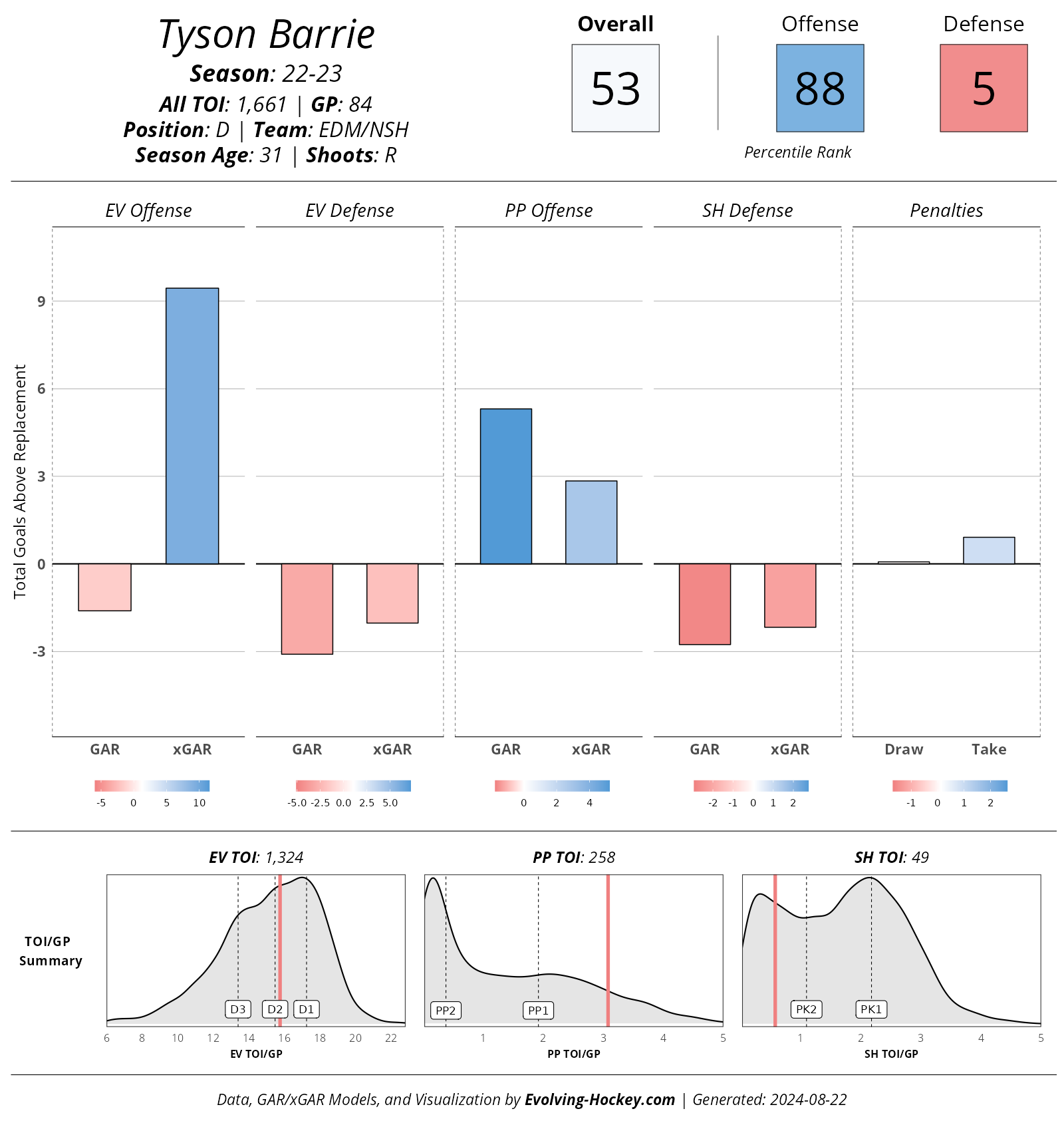 There are two main concerns for Barrie: he's not the strongest defender, and the Sharks already have a logjam of defensemen, with both Shakir Muhamadullin and Henry Thrun fighting for a roster spot. Is Barrie's offensive dip because of his usage on the Predators, or is he closer to being done?