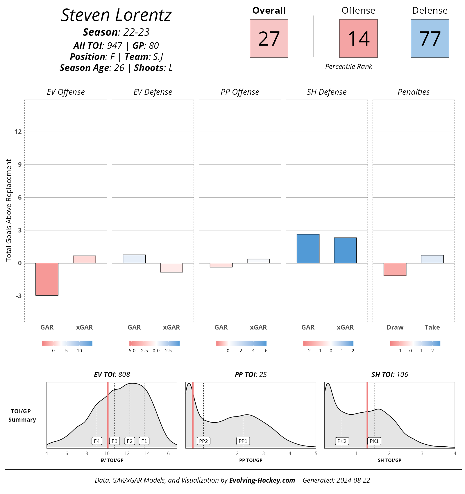 The primary issue with bringing Lorentz back is that the Sharks rebuilt much of their bottom six this offseason with the additions of Goodrow, Ty Dellandrea, and Carl Grundström. The Sharks put assets into acquiring Dellandrea and Grundström via trade, so they will have priority when trying to crack the lineup. On the Barracuda, Lorentz would be a great addition to add some depth down the middle.