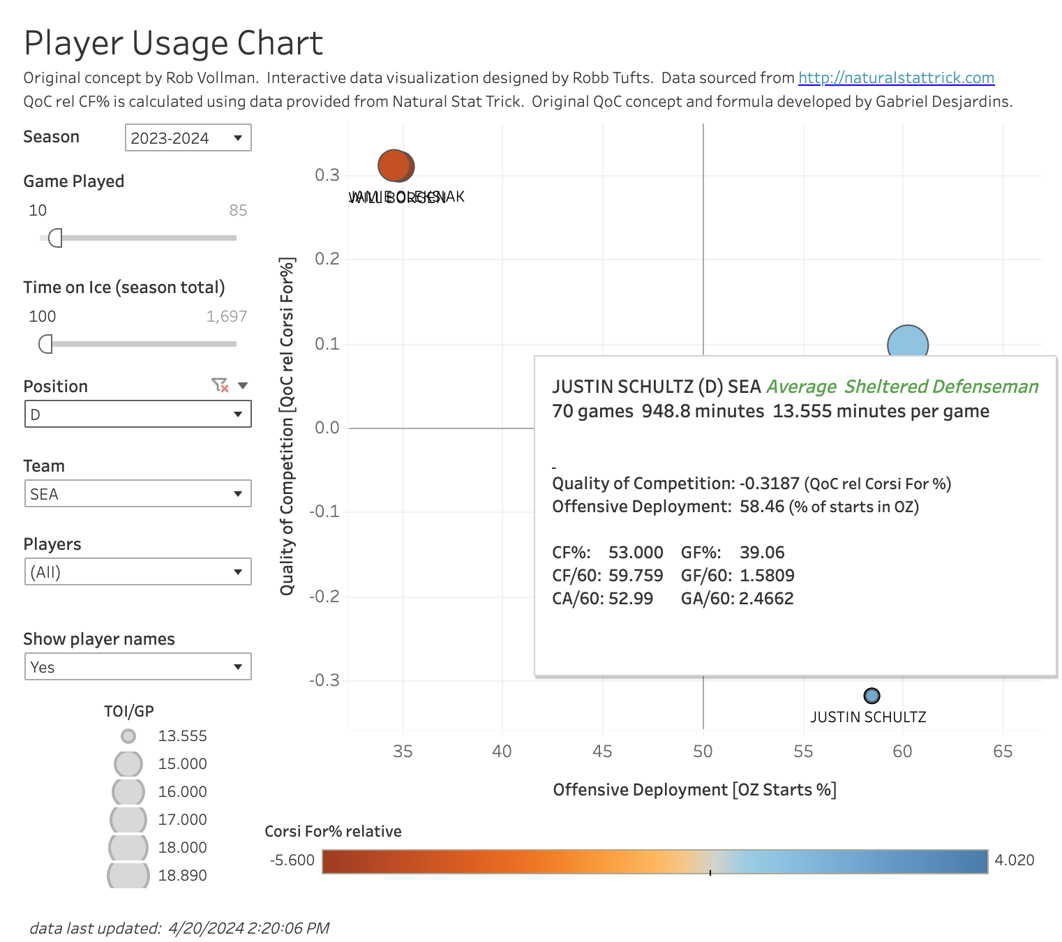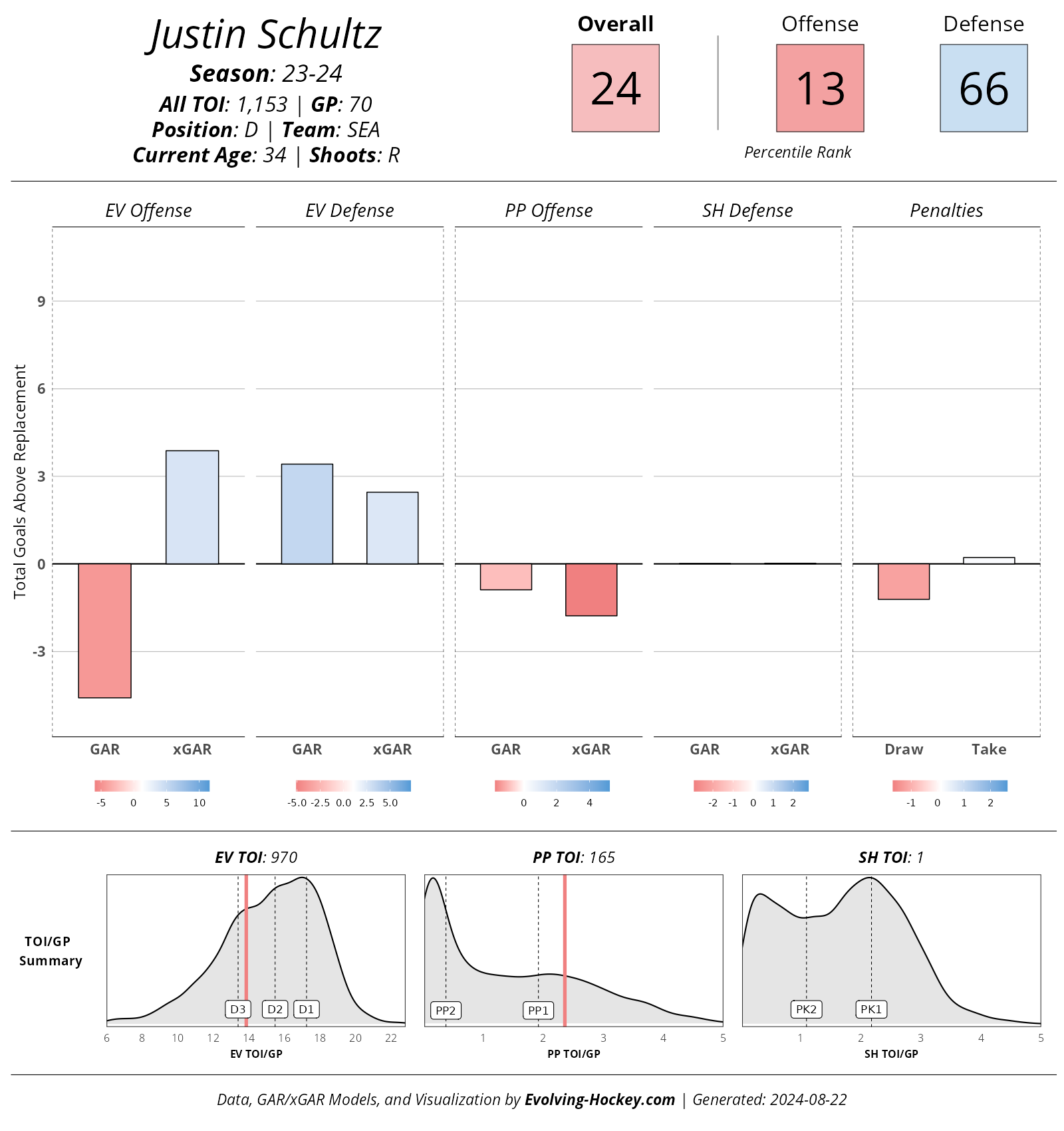 Justin Schultz is a few years older than Barrie but provides more defensively. Last season, the Kraken coaching staff gave him plus deployments against weak competition. Schultz is a better defender than Barrie and has also been a power play quarterback.