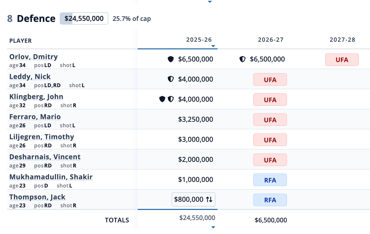 Mario Ferraro is entering the last year of his deal and is due for a raise from his current contract. If Ferraro signs a new contract during the season, Evolving Hockey projects an extension at 6 years at $4.83 million AAV. While the money doesn't matter (Sharks projected to have $62 million in cap space next year), the roster spot might be more necessary as the Sharks continue their rebuild.
