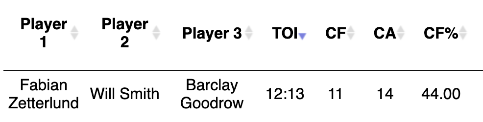 Will Smith had an ok night. He showed some of his patient passing and creativity with the puck but had some issues off the puck and with some pacing. These are normal issues for a young player, especially when transitioning from the NCAA to the NHL. College hockey is typically played at a slower pace, emphasizing structure over pace. (Side note: Macklin Celebrini is not a normal person and looks to be ready to take on a full role as a center)