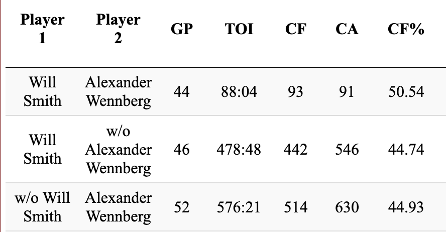 It's a small sample size, but Smith and Wennberg have generated more shot attempts than their opponents this season. While that may not seem very impressive, the Sharks as a team sit at 44.68 CF%.