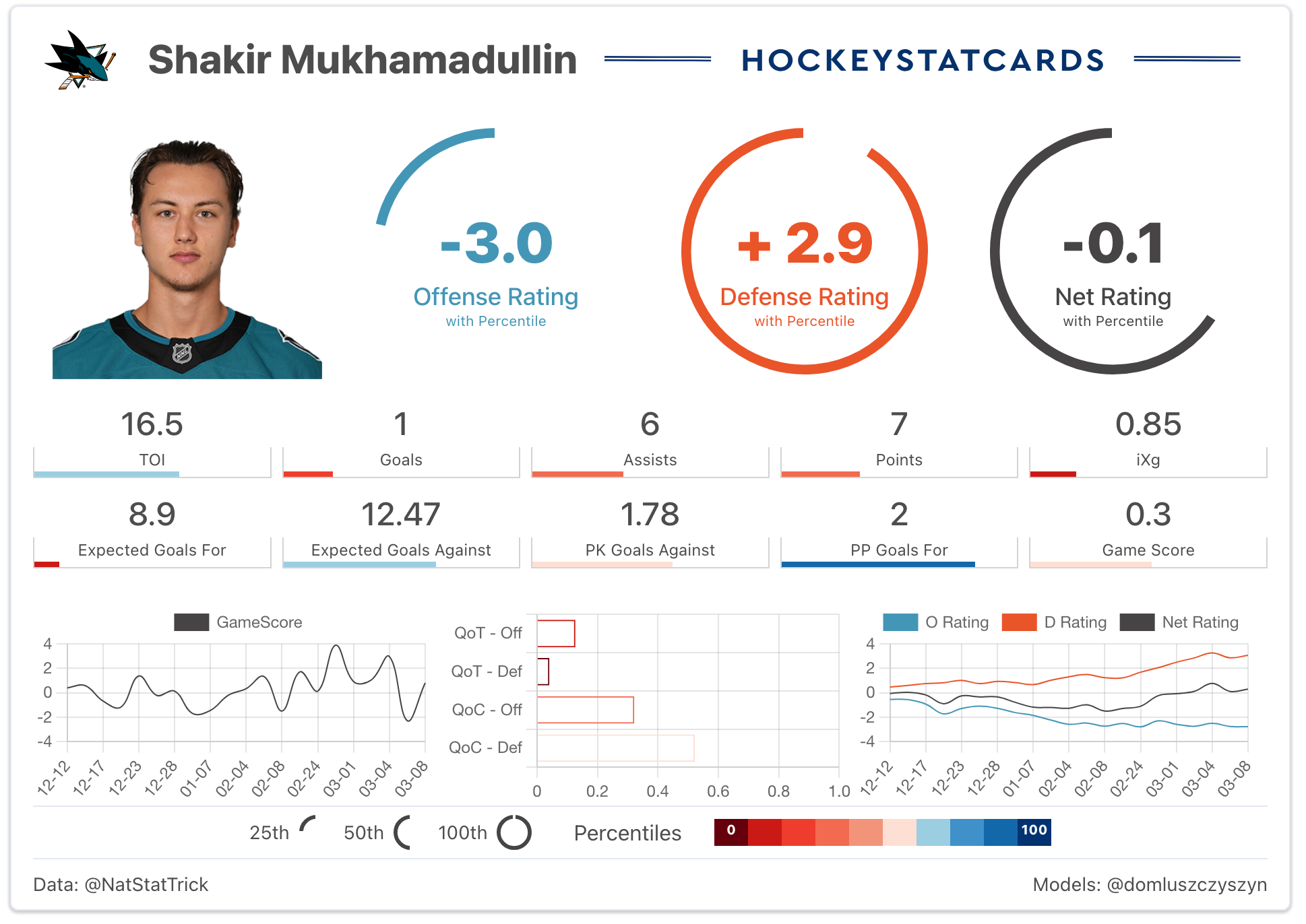 An offseason groin injury led to a stint on IR and the start of the year in the AHL, where he played a more defensively responsible role for the Barracuda than we had seen last season. He eventually earned a call-up, but the Sharks' significant log jam of defensemen prevented Mukhamadullin from getting an opportunity to play big minutes every night.